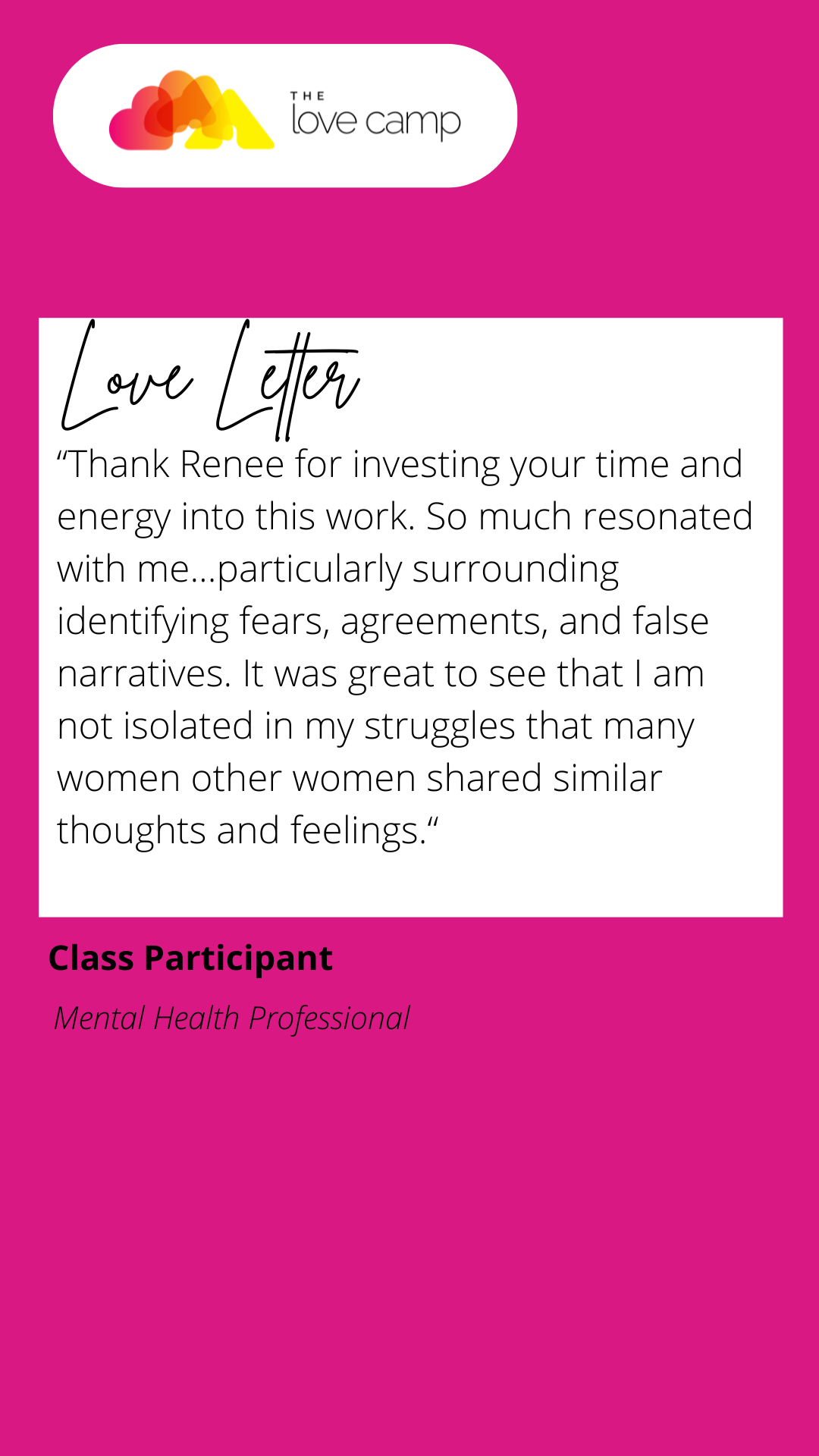 5. Exclusive Love Camp Curriculum: a comprehensive 12-week curriculum covering the four seasons, focusing on self-love, attraction, communication, honesty, trust, respect, safety, and vulnerability. VALUED AT $1,800
